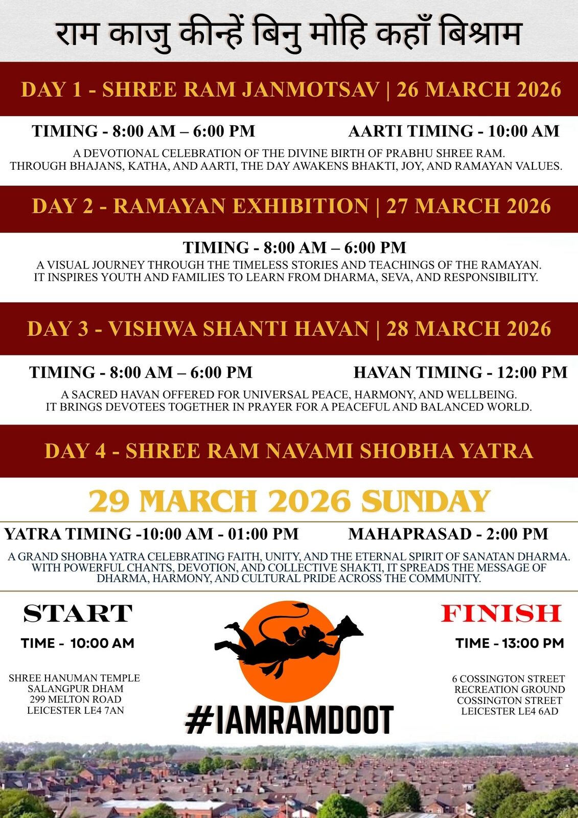 In 2026, we are organising Shree Ram Navami Janmotsav, a four-day devotional celebration dedicated to bhakti, seva, and cultural unity in our community.